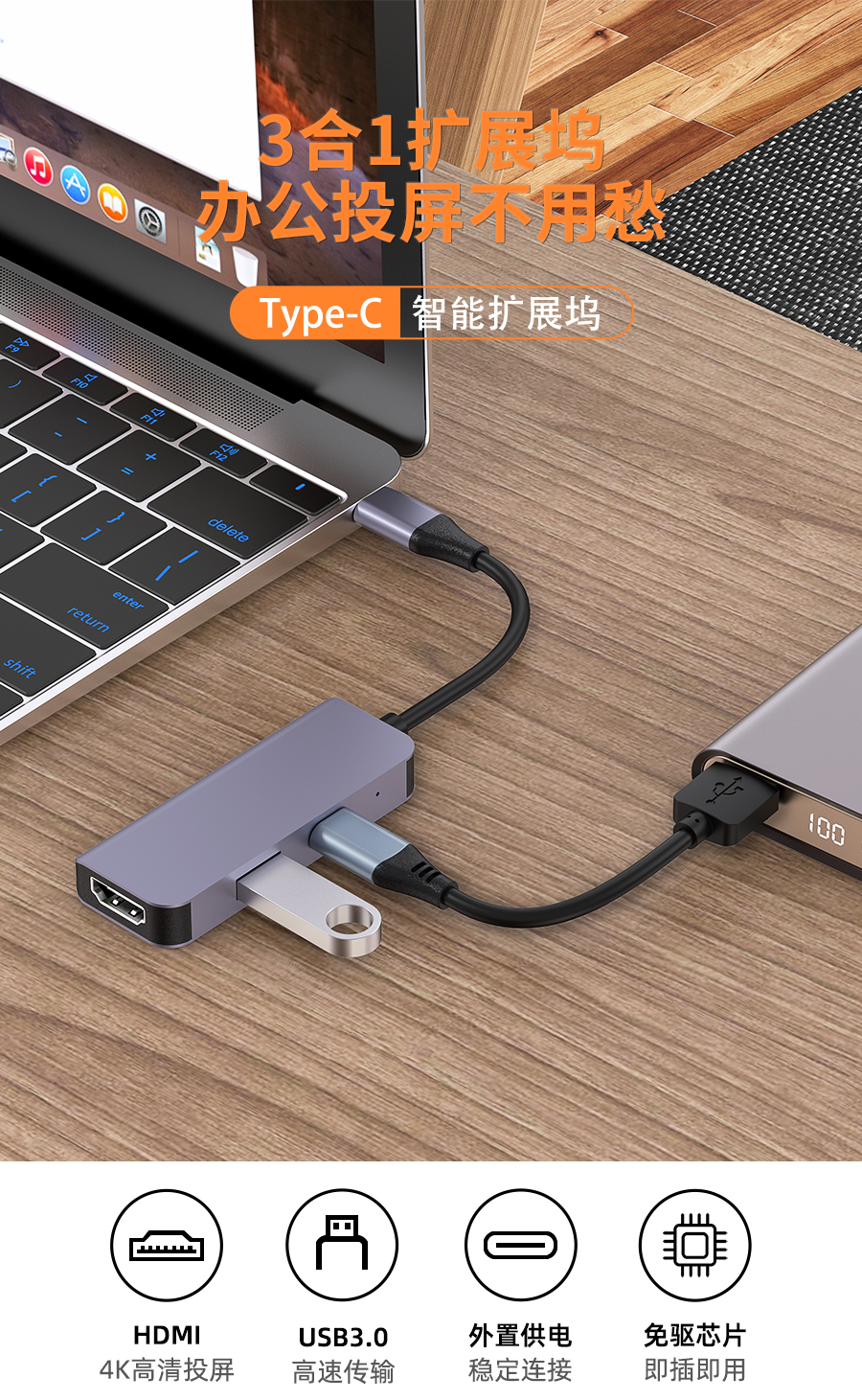 产品描述:三合一Type-c智能扩展坞支持4K高清分辨率,连接投影仪,显示器,液晶电视等超大屏显示器设备,畅享影院级视觉体验。铝合金外壳,散热不发烫。