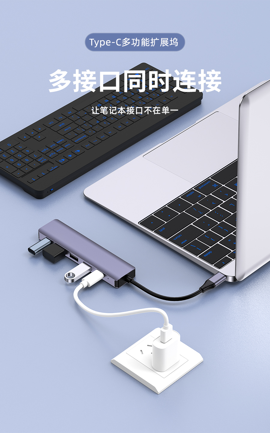 产品描述:5合1扩展坞Type-C Hub智能扩展坞,铝合金外壳散热快,USB2.0&3.0多接口同时连接,Type-C外置供电,免驱芯片.