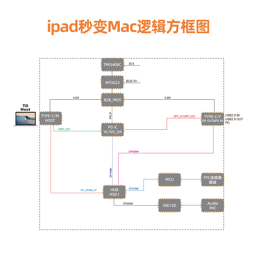 说明:ipad秒控键盘扩展坞,接线牢固、抗冲击强、不易变形、寿命长、连接紧密、厂家供应!兼容macOS,HarmonyOS,IOS,EMUI,Deepin等